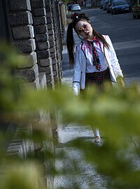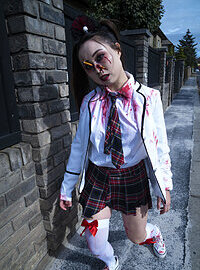 Movie description: "Zombie teen Halloween double team". Ricky Rascal and Nick Ross are playing video games in the garage when they hear shambling outside. Checking the door, they see an Asian stunner dressed as a schoolgirl... With a pencil sticking through her nose!T Hey tell her to scram and go back to their game, but the moaning walker enters the house.W Hen Ricky goes to refill his beverage, the zombie teen bites Nick, and when Ricky comes back to fend her off, he gets a bite for his trouble too!N Ow that they're all zombies, Yiming craves more flesh, so she gets on the couch, pulls up her skirt, and spanks her ass enticingly.N Ick and Ricky shamble over and take their dicks out, and Yiming sucks them both off at the same time.T Aking turns fucking her tight pussy and pretty face, Nick and Ricky cover Yiming in cum, then go back to their game... Before they turn!