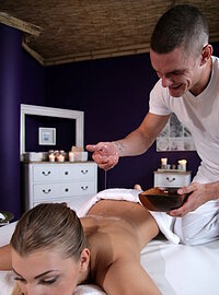 Movie description: "Heavy Orgasm for Big Boobs Teen". Max has a new client, and it's the oh-so-beautiful Serbian blonde teen Vyvan Hill. This fresh-faced beauty has had the hardest week and came to the Sexyhub Spa to get the tension worked out of her stiff shoulders, back, and legs. But Max is easily distracted by beautiful women, and Vyvan is a stunner! After pouring warm oil on her back, the buff masseuse sensually rubs it into her skin, making his way to her perky ass and thighs, and down to her perfect little feet. It's when she turns over that the real trouble begins. As Max's hands reach Vyvan's breasts, she begins to moan with pleasure. He finds her clit next, already wet with oil, and begins to finger the horny client. Soon, they are kissing and Max climbs on the table to join Vyvan for a slow, sensual suck and fuck that leaves them both feeling refreshed, relaxed, and ready for the day.