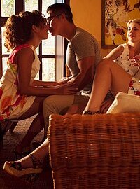 Movie description: "Spanish Holidays". A bunch of cute friends are cleaning up in the kitchen of their vacation villa, as Andrej Lupin's erotic movie 'Spanish Holidays' begins. As they chat and laugh, things rapidly turn heated, and El Gran Erick is joined by the three gorgeous girls in the bedroom. He kisses cute Lady Bug while MElody Petite and Olivia Sin make out, then they switch, and he smooches with sexy blonde Olivia as the other two undress each other. Soon all the girls are down to their panties, Hispanic sweetie MElody sitting on Eric's lap as her girlfriends tease her nipples. She turns her attention to busty Olivia as Lady Bug frees Eric's dick from his pants and starts to suck it, then leans in to get her share. Eric is in heaven as all three babes pamper his cock and balls, between eating each other's pussy. They move into a daisy chain with Eric fucking Olivia from behind as she licks MElody and MElody licks Lady Bug, who is the first to orgasm. MElody sits on Lady Bug's face, her dark nipples diamond hard, as Olivia goes wild, climaxing noisily. Lady Bug decides it's her turn to take Eric's dick now, lying back for him to drill her as the other girls assist, cumming hard as Olivia strums her clit. Finally, MElody straddles Eric and rides to a climax, then dismounts and lets Olivia jerk him off all over her beautiful breasts. It's a perfect day when everyone shares in the pleasure of a superb fourway.