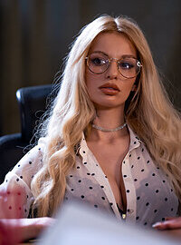 Movie description: "Blonde MILF boss office fantasy". Sexy blonde office worker Kaira Kampen is feeling hot, so she unbuttons her blouse and slips out of her panties in front of one of her clients. Brad is in for a treat when the bespectacled babe dons a tight leather outfit and teasingly blindfolds him before sticking out her gorgeous bubble butt and inviting him to eat her out! After tasting Kaira’s sweet pussy juices, dark-haired Brad feeds his throbbing erection to the domme, who gags on its thickness, and then Kaira gives him an erotic footjob! Desiring a fuck, the horny MILF straddles Brad and rides his huge cock cowgirl-style before spreading her legs so that he can penetrate her tight hole in missionary position. Following an intense side fuck on the bed, Brad is ready to cum, and the beefy hunk pulls out in time to shoot a load all over Kaira’s big titties!