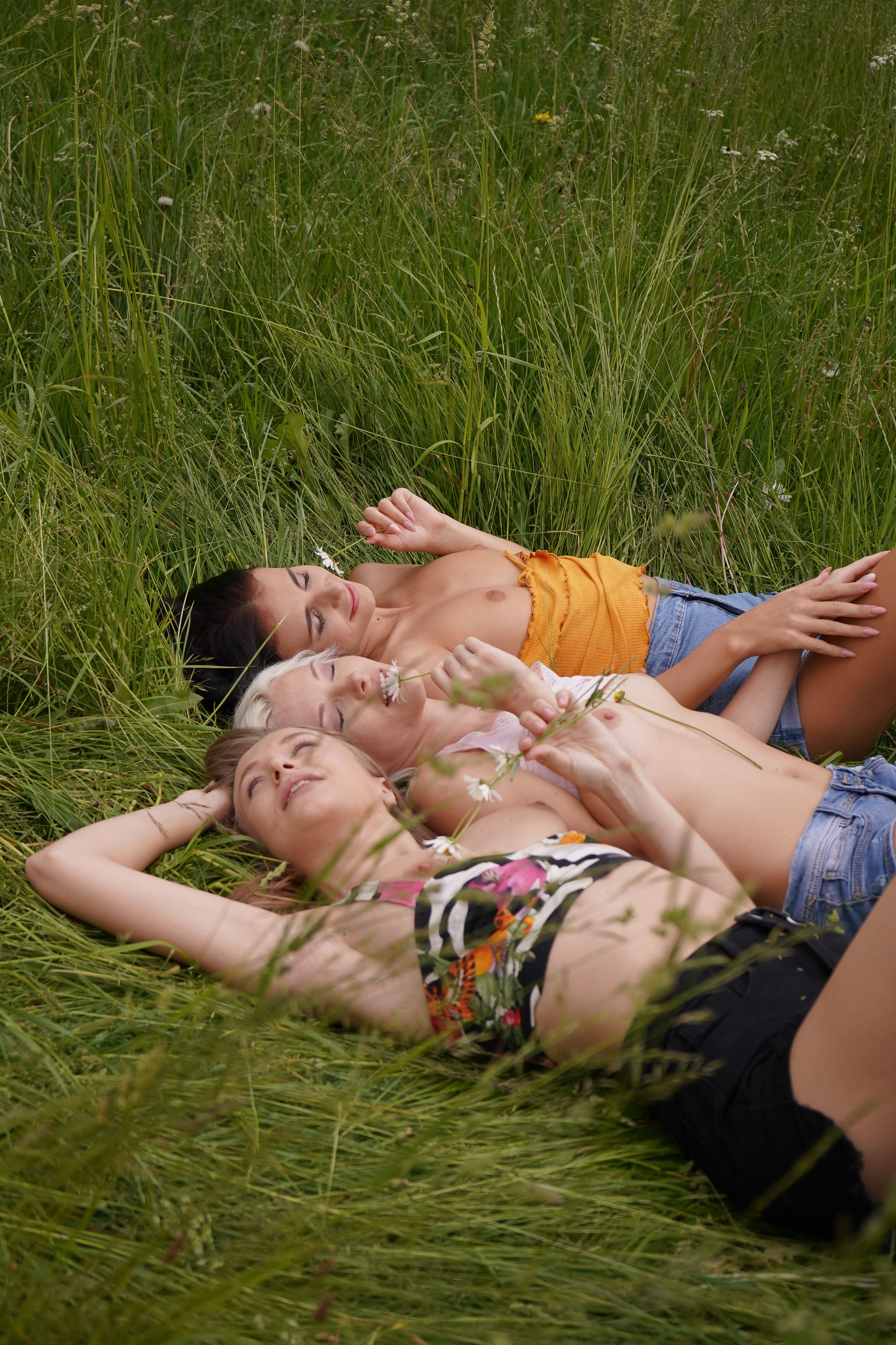 Photos description: "Pretty playful pussy licking trio". Pretty playful lesbian trio Aislin, Kate Rich, and Zazie Skymm are frolicking through a field without a care in the world. Collapsing into the soft grass, the ladies pick flowers and give each other bouquets, then lie back to look at the clouds. Feeling a pang of horniness, Zazie lifts her shirt and shows her lovers her boobs, which convinces the gang to head back to the homestead for some sensual pleasure. Walking arm in arm and grabbing each other's asses, the ladies retire to their villa. Aislin takes control and tells Zazie and Kate to eat her pussy, then takes turns pleasuring their tits at the same time. The three babes then have a sexy threesome that includes a pussy-eating train, face sitting, and plenty of orgasmic bliss!