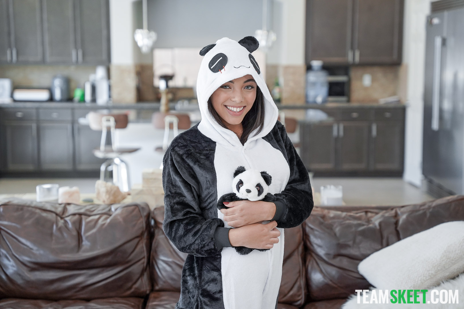 Photos description: "Puppet Pal Panda". Zerella Skies and her puppet pal panda are having a wonderful time wandering around the house, getting into all sorts of hijinks. But when she involves Quinton James in the games, he is less than impressed. Later, Zerella hides in the closet and surprises Quinton with a love tap from her puppet pal. Slightly aroused, Quinton and Zerella give the puppet pal panda a show it will never forget.