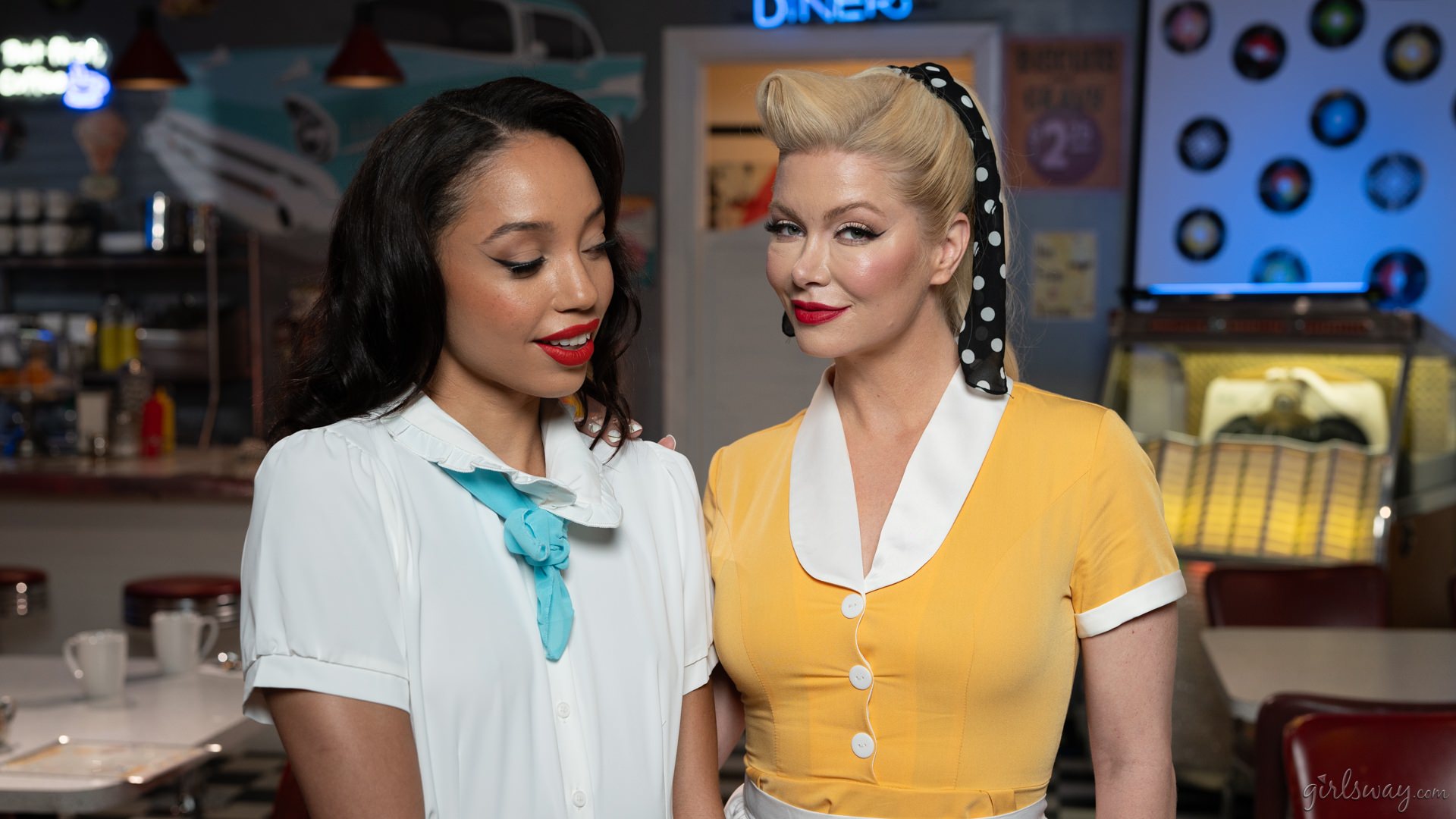 Photos description: "Care To Dance, Hun? ". In a cute diner in the 1950s, a waitress, Serene Siren, is tidying up. Alexis Tae is the last customer at the diner, but even though it's almost closing time, Serene tells Alexis she can stay as long as she wants. There are flirty vibes between them, though neither seems to have made a move yet. Serene continues cleaning as music plays from the jukebox. While she cleans, both she and Alexis groove to the music, wordlessly bonding over it while sparks continue to fly between them. Serene finally decides to make the first move, pulling Alexis up for a dance. They dance for a bit, and then Serene kisses Alexis, wanting to go further. Alexis is charmed and gives in to temptation.