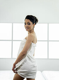 Photos description: "Oily massage for Latina babe". Scarlet Rebel has been doing really well by her budget, so she decides to treat herself with a professional massage from Michael Fly. Lying naked face down on the comfortable white mattress, Scarlet feels relaxed by the serene environment. Michael warms some oil in his hands, then begins to slowly caress Scarlet's shoulders. Michael throws away Scarlet's towel, and she smiles back at him when he starts to massage her thick booty. Michael takes the cue and tears the clothing from his body, oils himself up, and dives into Scarlet! Scarlet moans with delight as Michael gives her a body rub, then spreads her legs invitingly so Michael will fuck her wet pussy. The couple fuck intensely in missionary, then doggystyle position, then Scarlet takes control, and rides Michael's hard cock cowgirl style. Michael makes Scarlet cum in spoon, then she gives him a blowjob until he explodes for a hot facial!