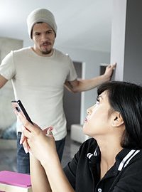 Slim brunette Angie Moon gets eaten out and fucked on the couch