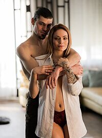 Photos description: "MEANWHILE - SCENE 2". Clara Mia has a big secret, one she's worried to bring up to her boyfriend Josh. Finally, she musters the courage to tell her man that she wants to have an open relationship. Josh is over-the-moon at the news! He runs to give Clara a hug before giving her a proper fuck.