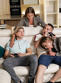 Photos description: "Seeing Double". Eveline Dellai and Silvia Dellai are always hard at work taking care of their stepson, Raul Costa. Raul’s friend, Nikki Nutz is stunned to find out that Raul has two stepmoms. The quartet have dinner and quarrel over video games.