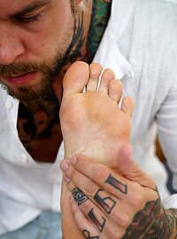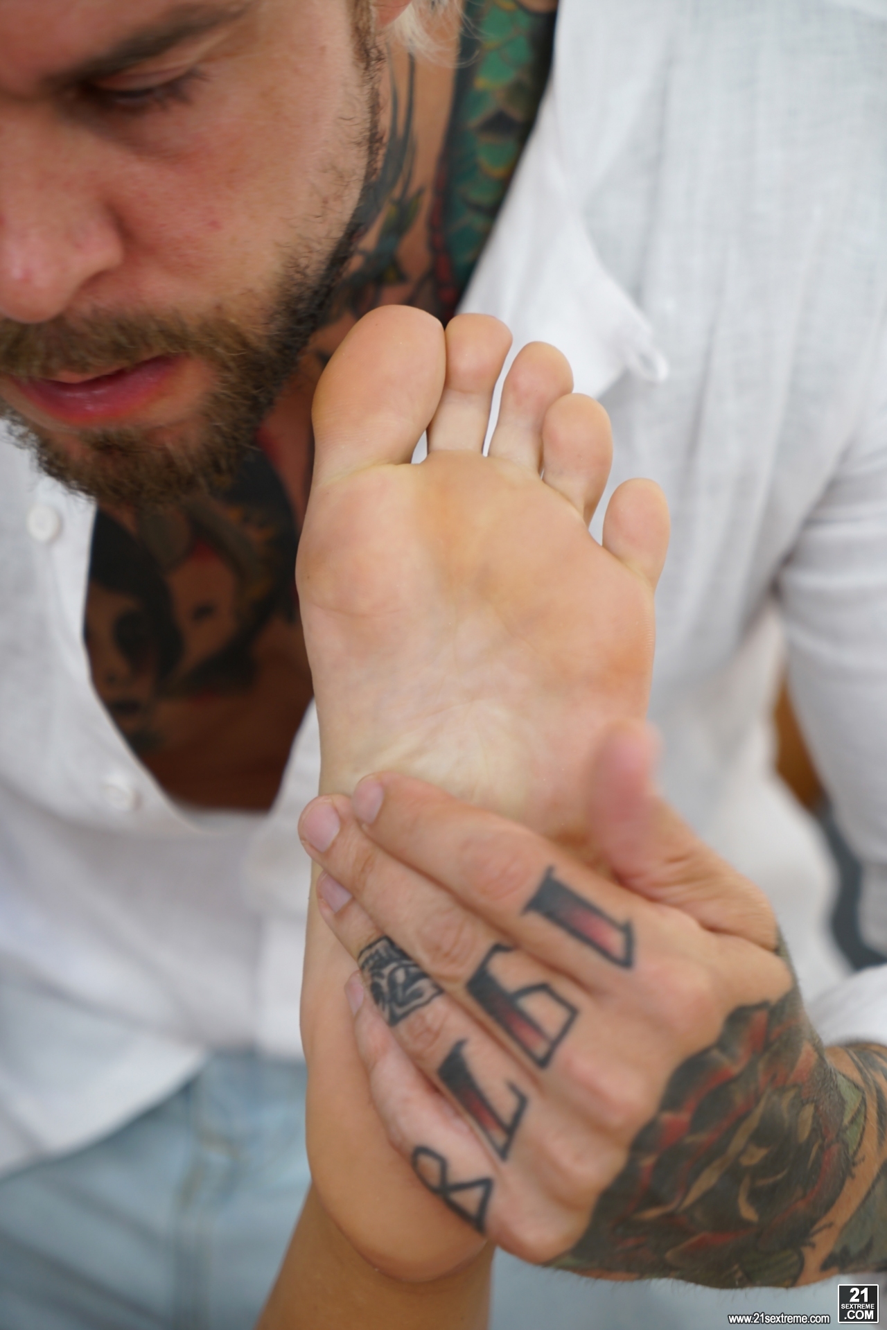 Photos description: "From Head To Toe". Beautiful blonde Cherry Kiss is enjoying sucking her own toes on her bed when Dean comes to have a piece of the action. He gently starts licking her feet and sucking her toes. Cherry proceeds to stroke his cock with her feet while he fingers her sweet pussy. She then goes down and swallows his thick cock until it is properly lubricated. Dean goes on by drilling her cooch and Kissing her foot at the same time. Cherry moans in pleasure from this deep pounding. She goes back to sucking and gives him a deep blowjob until he cums all over her pretty face. To top this off this naughty babe goes to have a warm pee in her bath tub and have a little taste off of her fingers.