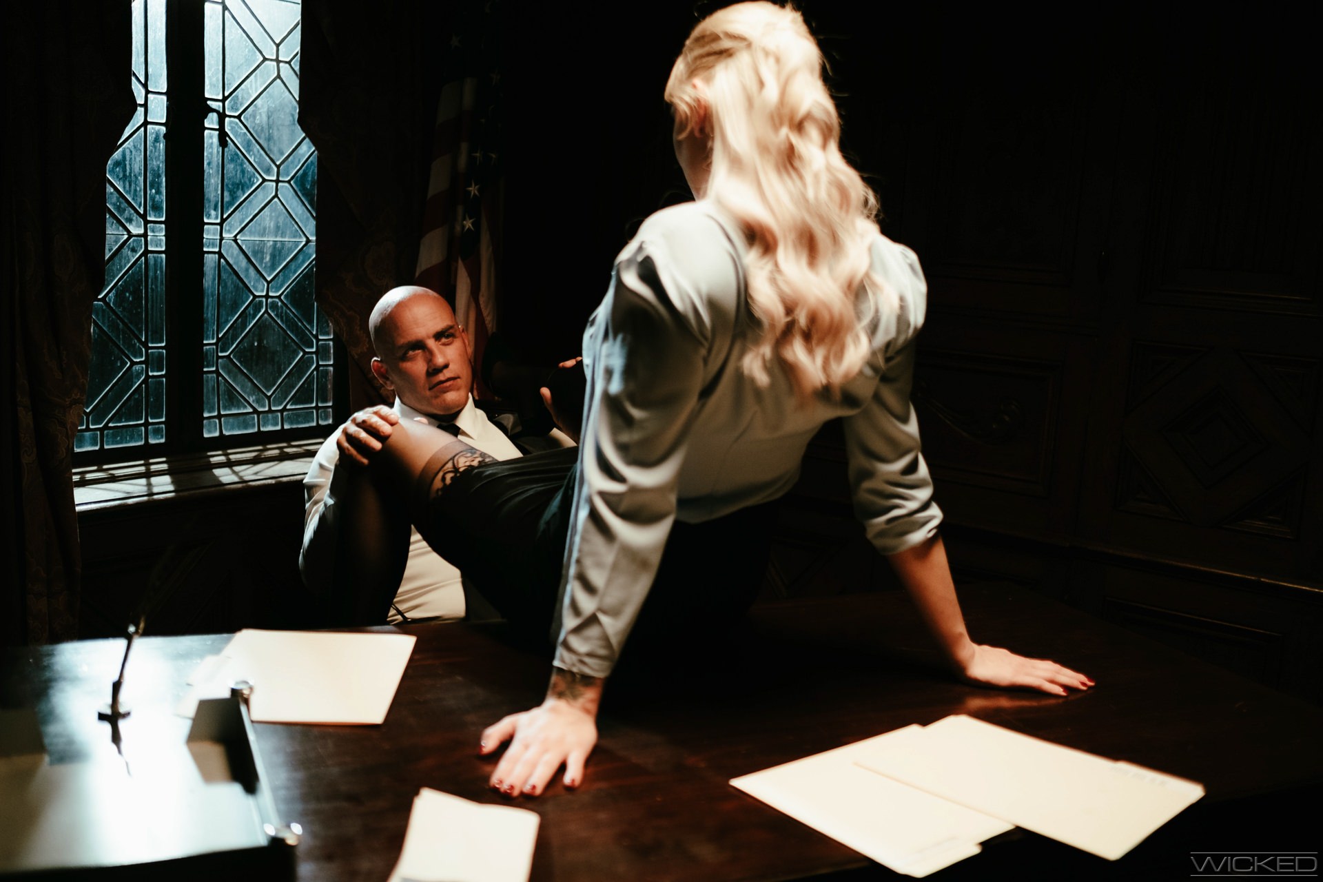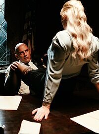 Photos description: "DERANGED - SCENE 2". Dr. Charlie Hayes (Kenzie Taylor) has an agenda and though the prison's warden, Marc (Derrick Pierce), can see right through it, he can't resist her feminine wiles. She wants the Curwin case, and she'll do whatever it takes to get it.