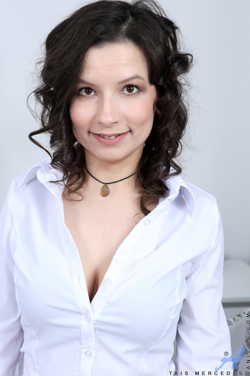 Photos description: "Brains And Beauty". Look how cute yet sexy Tais Mercedes is and then start imagining her dressed in leather and lace instead of just her black lingerie. This babe loves to be in charge. Once her puffy nipples and hairy cunt are bared, she grabs a big stick-on dildo to dominate since she's on her own while masturbating.