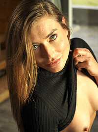 Dark-haired bombshell with big natural tits fucks herself on cam