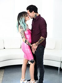 Photos description: "Holly Beth Latex Sex". Pouty dollface Holly Beth swayed sexily outside in her pastel candy pink latex dress, flashing her little bum, sending Small Hands a not so subtle hint that she'd like his company. Her excited clit deserved a romantic diddle and makeouts accompanied by a friendly pounding. She loves the feeling of being tossed gently down by her lover and penetrated by his stiff meat, riding him enthusiastically and taking it from behind as her natural tits and round bubble bounce. I love her squeals of orgasmic pleasure as Small Hands pumps away at her twat!