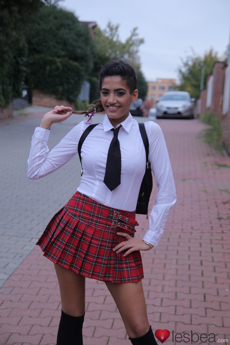 Photos description: "Maid fucks teen in school uniform". School uniform clad Penelope Cum is walking home, her teen hormones clamoring to be satisfied. As she opens the door to her house, Penelope notices the maid, her big ass poking out from her tight black skirt, is cleaning the house. Hanging back before the maid can see her, Penelope is so turned on by the maid that she starts to play with her pussy. Realizing she might be caught, Penelope makes her way past the maid, exchanging a courteous greeting, before climbing the stairs to her bedroom. The Spanish teen retrieves her trusty vibrator, and staring at the maid's big tits, pleasures herself deeply. Daphne, hearing the buzzing of the sex toy, turns around and sees Penelope, eyes closed and moaning in pleasure. Daphne takes the vibrator from Penelope, fucks her with it, then switches to a strap-on for some hot lesbian action!